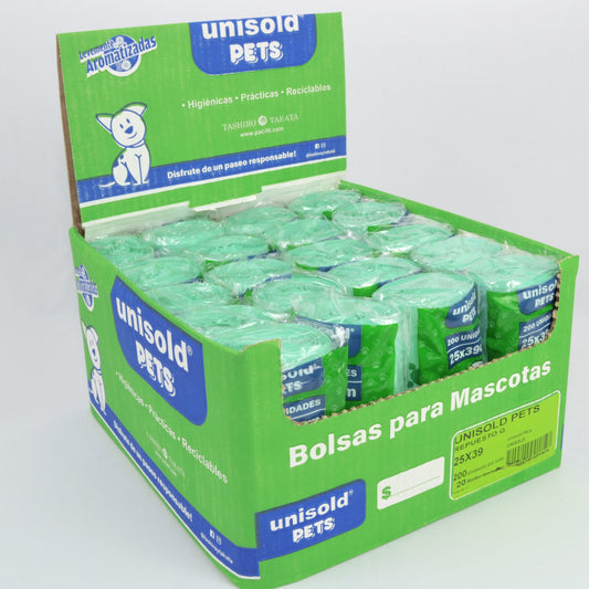 Bolsas para Residuos de Mascota. Incluye SOPORTE P. Medida 25x39 cm. Caja de 30 Rollos x 40 bolsas.
